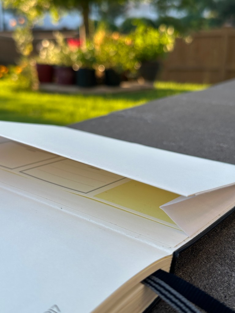 The back of the journal has a large pouch in which you can store papers. It also comes with stickers for the spine and the front cover.